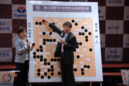 中國圍棋協(xié)會(huì)副主席華以剛與徐瑩講解第八屆春蘭杯半決賽謝赫與韓國棋手許映皓的對局