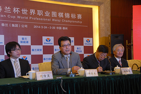 3月25下午5時,第十屆“春蘭杯世界職業(yè)圍棋錦標(biāo)賽”組委會在春蘭旗下泰州賓館牡丹園舉行了本屆“春蘭杯”第一階段比賽暨2014“春蘭-中國‘圍棋希望工程’基金”資助儀式新聞發(fā)布會,“春蘭杯”組委會執(zhí)行主任、春蘭(集團)公司高級副總裁劉亞夫,國家體育總局棋牌運動管理中心主任、中國棋院院長劉思明,日本、韓國代表團團長,中、日、韓著名棋手陳耀燁、井山裕太、李世石,以及來自全國各地的百余名記者出席新聞發(fā)布會。