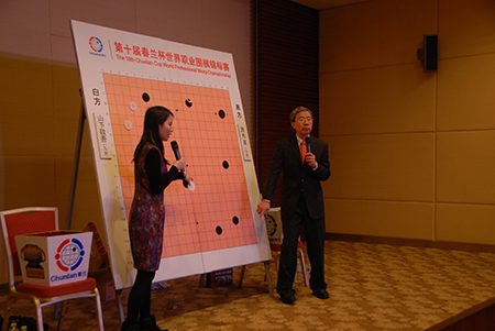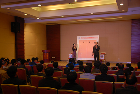 此外,同日下午4時,中國圍棋協(xié)會副主席華以剛與美女圍棋棋手陳盈,在泰州賓館文昌廳,為前來聽棋、觀棋的泰州市及江蘇省其它地區(qū)的棋迷,掛盤講解了第十屆“春蘭杯”第一階段首輪比賽唐韋星(中) 與山下敬吾(日)的精彩對局。