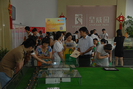盛夏來(lái)襲,優(yōu)惠抄底。7月27日(周日),泰無(wú)聊大型看房團(tuán)再度集結(jié)上百位網(wǎng)友,來(lái)到位于泰州城東核心商圈中央的星威園,讓他們切身體驗(yàn)一站式看房、購(gòu)房的樂(lè)趣。 來(lái)到星威園,看房團(tuán)成員就發(fā)現(xiàn)這一地帶人來(lái)人往十分繁華,因?yàn)閷?duì)面就是泰州最繁華的商品批發(fā)市場(chǎng)——溫泰市場(chǎng)、蘇北商業(yè)廣場(chǎng),旁邊是月星國(guó)際家居城、中嘉國(guó)際商場(chǎng)和嘉城國(guó)際廣場(chǎng)等,星威園便在這商圈正中央。同時(shí),這里的道路交通十分方便,售樓處與公交站臺(tái)近在咫尺,經(jīng)過(guò)星威園的公交線路有近10條,而且路徑四通八達(dá),有直達(dá)萬(wàn)達(dá)廣場(chǎng)的,也有直達(dá)金鷹和火車站的。 進(jìn)入星威園售樓處,氣勢(shì)磅礴的項(xiàng)目大沙盤(pán)便鎖定了看房團(tuán)成員的目光,大家圍在大沙盤(pán)前仔細(xì)觀賞、咨詢。據(jù)介紹,星威園包含了商、住各種房型,其戶型大小也基本滿足各層次用戶的需求,未來(lái),它將是泰州體量最大的高檔社區(qū)之一。目前別墅區(qū)已經(jīng)交房并有人入住,其他住宅樓宇正在建設(shè)中。