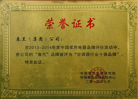 由工業(yè)和信息化部消費(fèi)品工業(yè)司指導(dǎo)、中國家用電器研究院主辦的“2013-2014年度中國家用電器行業(yè)品牌評價(jià)結(jié)果發(fā)布會”于9月26日在北京舉行,春蘭空調(diào)再度榮登中國空調(diào)行業(yè)“十大品牌”榜。這是繼2012年和2013年連續(xù)上榜后,春蘭空調(diào)三度蟬聯(lián)中國空調(diào)行業(yè)“十強(qiáng)品牌”稱號。