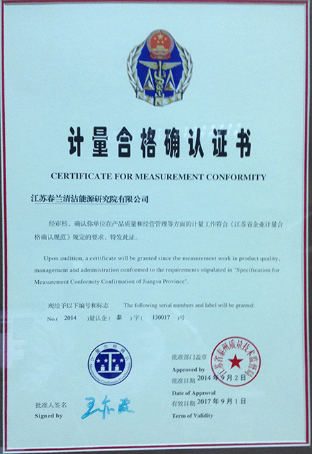 近日,春蘭清潔能源研究院有限公司獲得江蘇省泰州市質(zhì)量技術(shù)監(jiān)督局頒發(fā)的《計(jì)量合格確認(rèn)證書》。