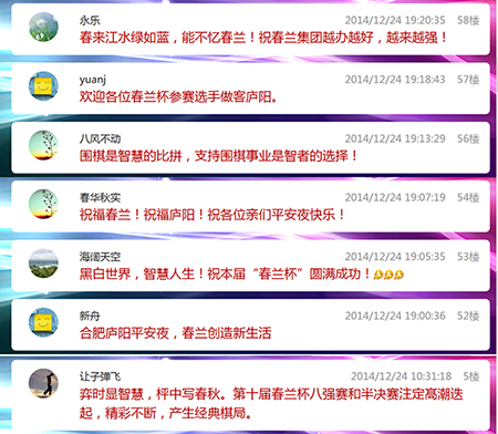 黃衛(wèi)東表示,主辦方將“春蘭杯”這種高規(guī)格的世界職業(yè)圍棋大賽安排在合肥市廬陽區(qū)舉行,是對(duì)廬陽區(qū)承辦高規(guī)格世界圍棋賽事能力的充分肯定,承辦此次賽事是宣傳廬陽,展示廬陽的極好機(jī)會(huì),有利于豐富廣大群眾的文化生活內(nèi)容,擴(kuò)大合肥和廬陽區(qū)與海內(nèi)外的文化體育交流,促進(jìn)當(dāng)?shù)鼐裎拿鹘ㄔO(shè)。他們將全力做好各項(xiàng)保障工作,確保比賽取得圓滿成功。 酒會(huì)上,參加第十屆“春蘭杯”八強(qiáng)賽的八位棋手——古力、陳耀燁、羋昱廷、周睿羊、時(shí)越、張栩、樸廷桓、金志錫分別發(fā)表了賽前感言。